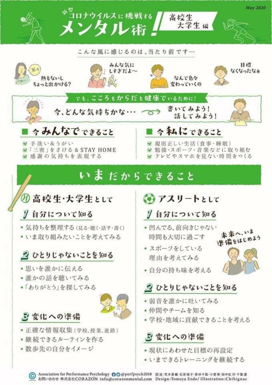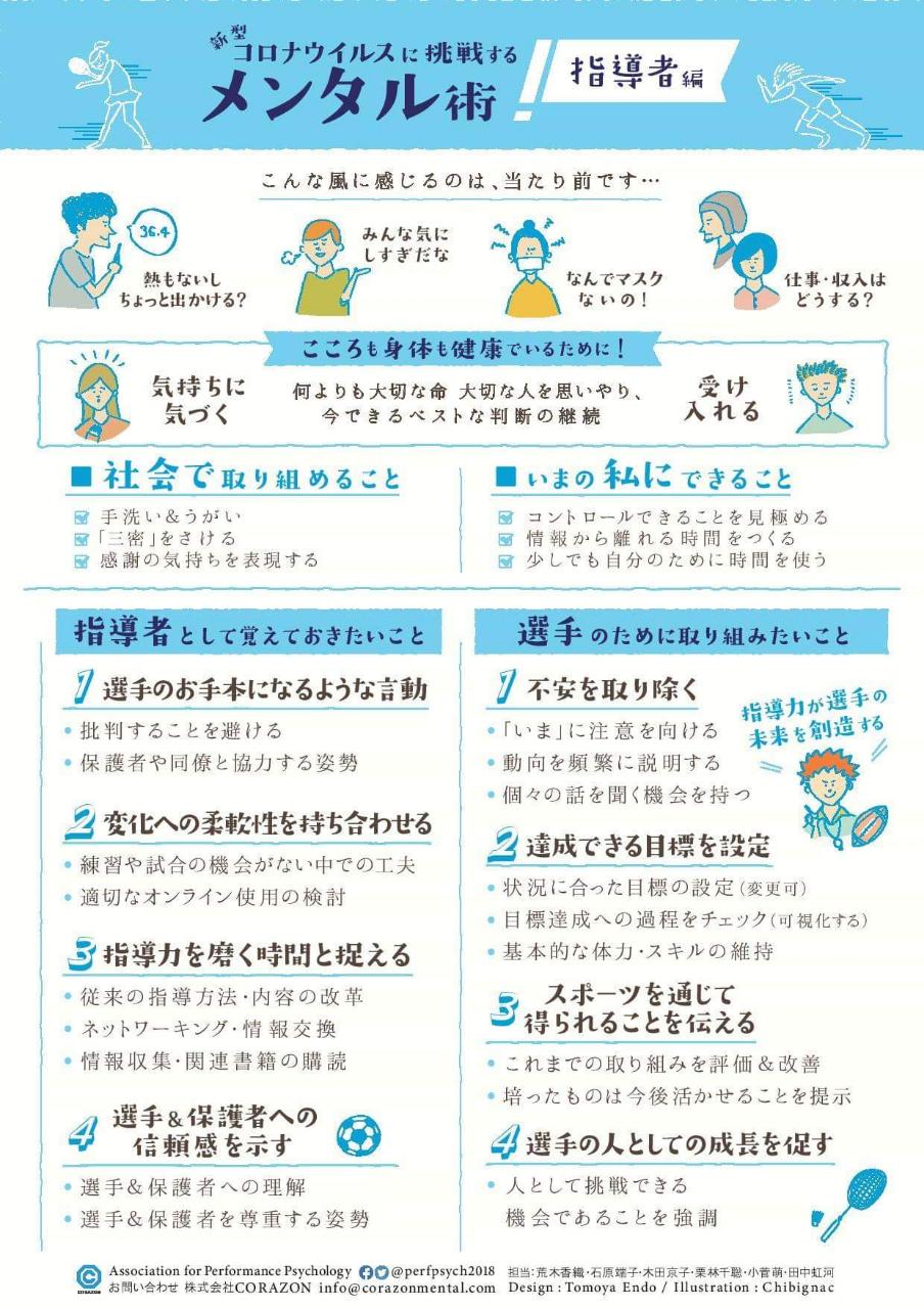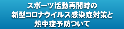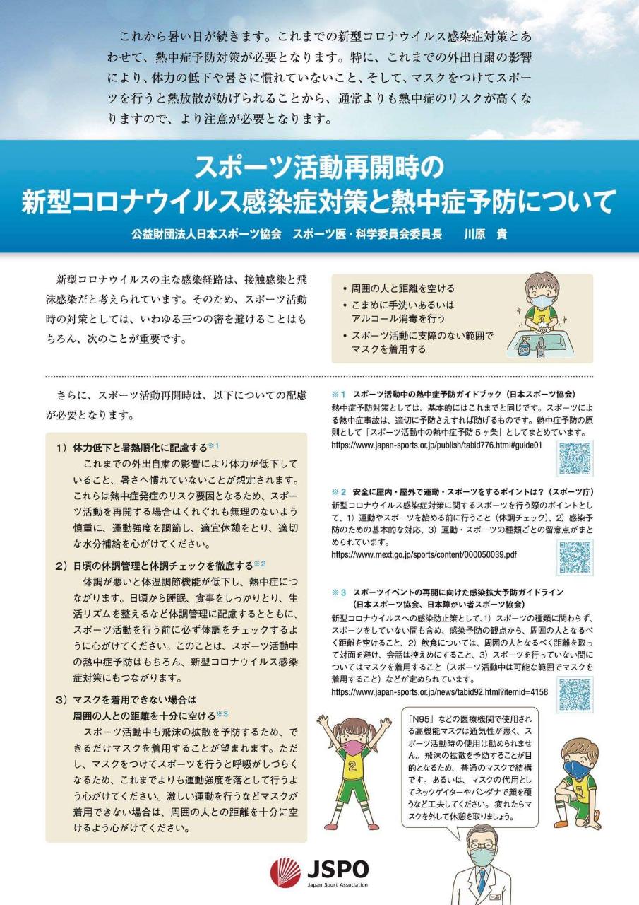 (この資料は、全国各地の総合型地域スポーツクラブ・スポーツ少年団関係者の皆さんがダウンロードしてご活用ください。なお、ダウンロードする場合はNPO法人新町スポーツクラブへご連絡ください。) - スポーツ活動再開時の新型コロナウイルス感染症対策と熱中症予防について
